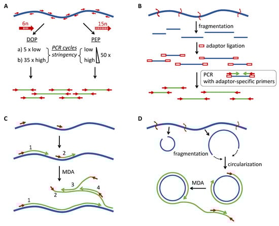 WGA methods can be classified as PCR-based or as based on multiple displacement amplification (MDA) []. In addition, there are methods that do not conform to this distinction, as they either combine both principles or are based on non-related principles [,,].