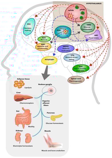 The central and peripheral targets of the brain oxytocin systems in metabolic regulation. Oxytocin is synthesized from the magnocellular neurons of both the paraventricular nucleus (PVN) and supraoptic nucleus (SON). The PVN and SON are sensitive to nutrients (e.g., glucose, sucrose, and leucine) and other hormones (e.g., leptin, insulin, cholecystokinin, and glucagon-like peptide type 1) and influence energy intake and energy balance. Magnocellular oxytocin neurons in the PVN (mPVN) and SON possess axonal projections to the neurohypophysis of the pituitary, from which oxytocin is released into systemic circulation. Parvocellular oxytocin neurons in the PVN (pPVN) project axons to a variety of brain regions, including to the arcuate nucleus (ARC) (receives afferent oxytocin fibers from both mPVN and pPVN), the ventral tegmental area (VTA), the nucleus accumbens (NAc), the amygdala (AMY), the hippocampus (HIPPO), prefrontal cortex (PFC), dorsal vagal complex (DVC), and spinal cord, each of which contains oxytocin receptor-expressing neurons and has important involvement in the regulation of energy balance. Moreover, extrasynaptic oxytocin release from the dendrites of magnocellular oxytocin neurons in the PVN and SON into the ventromedial nucleus (VMN) and AMY are also seen. Oxytocin exerts metabolic effects in multiple organ systems (e.g., gastrointestinal motility, muscle and bone anabolism, lipolysis, and pancreatic insulin secretion) through the secretion of oxytocin in the periphery via the neurohypophysis of the pituitary.