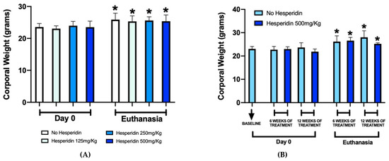 Figure 1. Corporal weight of mice before experiments (Day 0) and at euthanasia. The graphs show a uniform increase in corporal weight in both periodontal disease (A) and femur (B) mouse models at euthanasia compared to Day 0. * p < 0.05 compared to the respective group at Day 0.