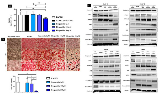 Figure 2. Overview of in vitro RANKL-induced osteoclastogenesis. RAW 264.7 cells were stimulated by RANKL with or without hesperidin treatment for 5 days. There were no differences in the percentage of apoptotic cells after 5 days of in vitro differentiation compared to RANKL control groups as measured by the TUNEL assay, except for the 500 µM HE group (A). (B) Representative images demonstrate cells differentiated in osteoclasts stained in pink by TRAP assay, 5 days post RANKL stimulation (4×, 10× and 20× magnification). Lower graph represents the average number of osteoclasts (TRAP+) quantified per group including no RANKL addition (no bar/no cells observed). Cells with 3 or more nuclei are considered osteoclasts. * p < 0.05 compared to the 500 µM hesperidin group. Hesperidin significantly affected differentiation of osteoclasts in a dose-dependent manner. (C) Protein expression for Caspase 3, c-Fos, NFATc1, p62, LC3, Total ERK ½, Phosphorylated ERK ½ and Beta-Actin1 was assessed by Western blot (WB) on days 2, 3, 4 and 5 post-RANKL treatment from the sample protein lysates. Results showed influence of hesperidin on autophagy markers LC3 to LC3-IIB (upper and lower bands in LC3B row, respectively), p62 and ERK ½ with day 5 showing most clear autophagy inhibition effect via accumulation of LC3, marked increase in p62 and absence of ERK ½ phosphorylation (WBs were done in triplicates and representative images displayed).