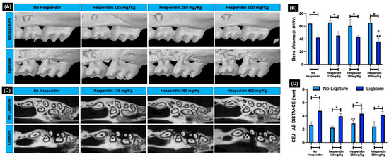 Figure 3. Two and three-dimensional analysis of alveolar bone. (A) 3D and (C) 2D rendering of maxillae showing bone levels. (B) Graph expresses the average percentage of bone volume (BV) to total volume (TV) in each experimental group analyzed using µCT, showing significant bone loss promoted by ligature in all groups. Treatment with hesperidin at 500 mg/kg significantly decreased bone volume compared to the lowest concentrations of hesperidin. * p < 0.05 comparing group with and without ligature. ** p < 0.05 compared to the group ** 125 mg/kg + ligature and # 250 mg/kg + ligature. The 3D (A) and 2D (C) representative images show alveolar bone integrity verified in all groups of animals that did not receive ligature, while in the other groups subjected to experimental periodontitis, bone resorption can be observed. Correlated to these findings, the linear measurement of cemento-enamel junction (CEJ) distance showed a higher bone loss in the ligature groups (D). * p < 0.05 comparing group with and without ligature. ** p < 0.05 comparing no ligature groups HE 125mg and 250 mg/kg.