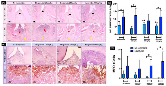 Figure 4. Histopathological and stereometric evaluation of the periodontal tissues (H&E and immunohistochemistry). (A) In the representative images from each group, black arrows indicate the integrity of alveolar bone crest in the groups of animals that did not receive ligature, while marked bone resorption (yellow arrows) can be seen in the ligature groups. Red arrows indicate the presence of clear inflammatory gingival infiltrate in all groups with experimental periodontitis confirmed by stereometry (B) showing a significant increase in inflammatory cells compared to the no-ligature groups. * p < 0.05 comparing ligature and no-ligature groups. ** p < 0.05 hesperidin 250 and 500 mg/kg compared to lower dose of hesperidin and no ligature. Complementary to these findings, the myeloperoxidase (MPO)-positive cells, stained in brown via immunohistochemistry (C), were increased in all ligature groups and were significantly increased for 250 and 500 mg/kg hesperidin-treated ligated mice compared to their respective no ligature counterpart (* p < 0.05) (D). Photomicrographs—20× magnification.