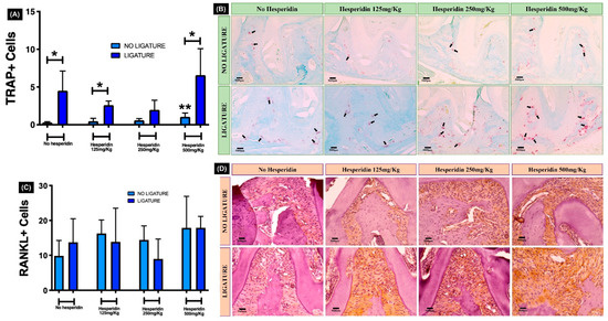 Figure 5. Quantification of osteoclasts in alveolar bone tissue. (A) Graph shows a significant increased number of TRAP+ cells in the bone tissue, generated by ligature placement. In (B), the black arrows indicate the multinucleated osteoclasts stained in pink (TRAP+ cells) on bone surface. * p < 0.05 comparing ligature and no-ligature groups; ** p < 0.05 compared to no-ligature and no-hesperidin group. The number of RANKL+ cells stained in brown (D) was not affected by ligature and/or hesperidin treatment (C). Photomicrographs—20× magnification.
