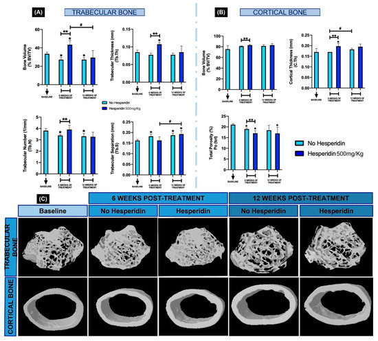 Figure 6. Microcomputed tomographic evaluation of femoral bone at baseline, 6 and 12 weeks post-hesperidin treatment. The microarchitecture parameters of trabecular (A) and cortical bone (B) evaluated were bone volume fraction (BV/TV, %), trabecular thickness (Tb.Th), trabecular number (Tb.N), trabecular separation (Tb.S), cortical thickness (C.Th) and cortical total porosity (Po.tot). Systemic hesperidin treatment increased BV/TV in both trabecular and cortical bone at 6 weeks, but the difference to no hesperidin was not maintained at 12 weeks. In (C), 3D reconstructed models of femurs show trabecular and cortical representative images per group. * p < 0.05 compared to the baseline group. ** p < 0.05 comparison between hesperidin and no hesperidin at the 6-week time point. # p < 0.05 comparing between 6 and 12 weeks.