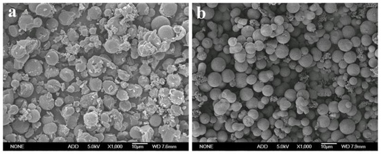 Previous work showed that the hemicelluloses extracted from the dissolving pulp mainly comprised (1→4)-linked β-D-xylans, which is a good raw material for producing carbon spheres by hydrothermal carbonization [30]. In this work, the hydrothermal carbonization of the hemicelluloses was performed in 2% H2SO4 solution because the addition of acid could promote the degradation of hemicelluloses into furan compounds and significantly improve the yield of carbon spheres [15,31]. As compared with the carbon sphere yield of 33.9% obtained from water, a much higher carbon spheres yield of 44.6% was achieved when the hydrothermal carbonization was carried out in 2% H2SO4 solution. The morphology of the hydrothermal carbon spheres was detected with SEM and shown in Figure 1. The hydrothermal carbon spheres prepared in 2% H2SO4 solution were more regular and smooth.