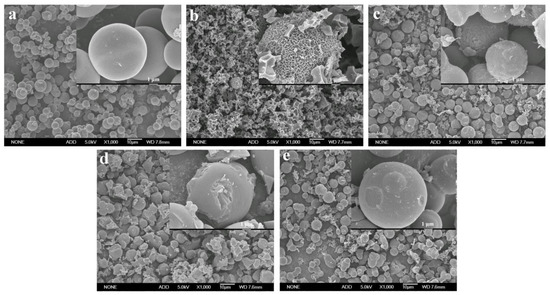Generally, the carbon materials obtained from hydrothermal carbonization show poor specific surface area and porosity, which makes it difficult for them to meet the requirements of supercapacitors [15,21]. In this work, four activators, including KOH, K2CO3, ZnCl2, and Na2CO3, were used to improve the pore structure and specific surface area of the hydrothermal carbon spheres. The activated carbon spheres without the addition of the activator were recorded as ACS, and the carbon spheres activated with KOH, K2CO3, Na2CO3, and ZnCl2 were recorded as ACS-KOH, ACS-K2CO3, ACS-Na2CO3, and ACS-ZnCl2, respectively. Figure 2 shows the SEM images of these activated carbon spheres (ACS, ACS-KOH, ACS-K2CO3, ACS-Na2CO3, and ACS-ZnCl2). It can be seen that the surface of ACS was still smooth, and the morphology of ACS hardly changed during the calcination process. However, the surface of ACS-KOH, ACS-K2CO3, ACS-Na2CO3, and ACS-ZnCl2 became rough. Among them, the spherical shape of ACS-KOH was seriously damaged. Similar results were also observed in the KOH-activated carbon materials derived from glucose, and it was stated that the obvious etched morphology was correlated with the fusion of KOH drops on the surface or the formation of a liquid-phase intermediate during activation [28,32]. It is worth noting that although many pores were observed in the SEM images of ACS-KOH, these pores were mainly macropores. Mesopores and micropores can rarely be observed in SEM images because of their small sizes. Therefore, the mesopores and micropores of the samples were further characterized by N2 adsorption and desorption measurement.