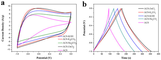 (a) CV curves (50 mV/s) and (b) GCD curves (1 A/g) of ACS, ACS-Na2CO3, ACS-KOH, ACS-K2CO3, and ACS-ZnCl2 in 6 M KOH in three-electrode system.