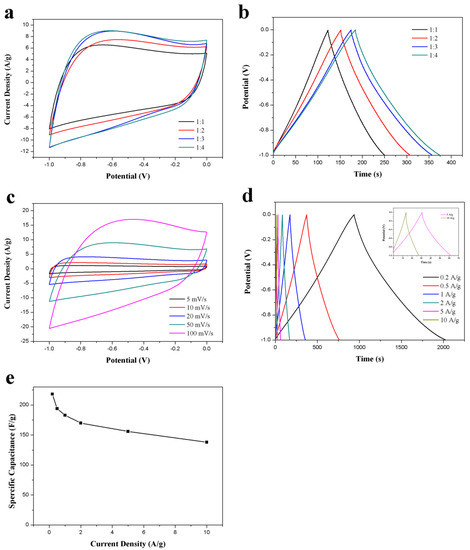To further optimize the electrochemical performance of ACS-ZnCl2, ZnCl2-activated carbon spheres were prepared under different ZnCl2/hydrothermal carbon spheres weight ratio (1, 2, 3, and 4). The CV and GCD results of these ACS-ZnCl2 in a three-electrode system were presented in Figure 5a,b, respectively. The results suggested that the specific capacitance of the ACS-ZnCl2 electrode increases with the dosage of ZnCl2. When the mass ratio of ZnCl2 to hydrothermal carbon spheres is 3:1, the specific capacitance is 183 F/g at 1A/g. However, the specific capacitance (188 F/g) is almost unchanged when the mass ratio of ZnCl2 to hydrothermal carbon spheres further increases to 4:1. Therefore, the performance of the ACS-ZnCl2 material obtained at a ZnCl2/hydrothermal carbon spheres weight ratio of 3:1 was tested to evaluate the potential of ACS-ZnCl2 as electrode materials in a three-electrode system with 6 M KOH as the electrolyte, and the results were shown in Figure 5c–e. The rate performance of ACS-ZnCl2 electrode was investigated using CV tests at different scan rates. Figure 5c shows that the CV curves exhibit a rectangular-like shape at all scan rates, and the area under the CV curves increases with the scan rates, increasing from 5 to 100 mV/s, suggesting the highly capacitive behavior of the prepared carbon materials with good ion response [47]. GCD curves of the ACS-ZnCl2 electrode at current densities from 0.2 to 10 A/g (Figure 5d) exhibited a slightly twisted isosceles triangle, and no obvious IR drop was observed at the beginning of the discharge process, indicating the good reversibility of the ACS-ZnCl2 electrode. The corresponding specific capacitance of the ACS-ZnCl2 electrode at different current densities is shown in Figure 5e. From the GCD curves, the specific capacitance of the ACS-ZnCl2 materials obtained at a ZnCl2/hydrothermal carbon spheres weight ratio of 3:1 was 218 F/g at a current density of 0.2 A/g. When the current density further increased to 10 A/g, a specific capacitance of 138 F/g was observed. The capacitive performance suggested a good rate capacitive behavior of the ACS-ZnCl2 materials [23].