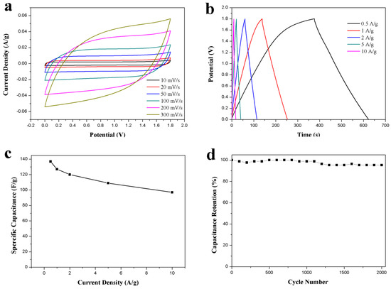 The capacitive performance of the as-prepared ACS-ZnCl2-based symmetric supercapacitor was tested for practical application. The supercapacitor was assembled by employing two identical ACS-ZnCl2 electrodes in 2 M Li2SO4 electrolyte because of the high work potential of the neutral Li2SO4 electrolyte [16]. The CV curves of the ACS-ZnCl2-based supercapacitor in the voltage window of 0–1.8 V are shown in Figure 6a. The curve shape was almost unchanged with the increase in the scan rate from 10 to 300 mV/s, revealing a good rate performance of the ACS-ZnCl2-based supercapacitor. The GCD curves of the supercapacitor at current densities from 0.5 to 10 A/g are shown in Figure 6b. The IR drop is relatively low, suggesting that the supercapacitor has low internal resistance because of fast ion diffusion and charge transfer. The specific capacitances calculated from the GCD curves are summarized in Figure 6c. It can be seen that the specific capacity decreased with the increase in the current density. The specific capacitance is 137 F/g at 0.5 A/g and decreases to 100 F/g at 10 A/g, indicating a good rate capability of 73% capacitance retention with the growth of current densities from 0.5 to 10 A/g. Based on its high specific capacitance, a high energy density of 15.4 Wh/kg at 0.5A/g was obtained at a power density of 224 W/kg. The energy density of the ACS-ZnCl2-based symmetric supercapacitor is higher than that of conventional supercapacitors using activated carbon as the electrode material [5,47]. Moreover, the capacitance retention tests performed at 10 A/g for 2000 cycles are shown in Figure 6d. This suggested that more than 95% capacitance retention was observed after 2000 cycles.