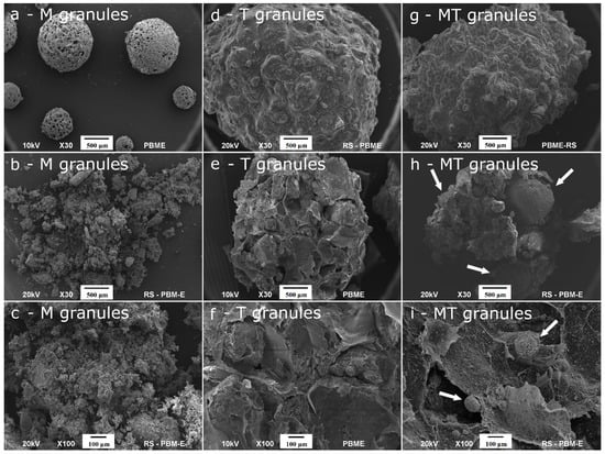 Representative SEM images of the samples: ceramic microgranules (AgM and GaM) (a–c); composite granules (AgT and GaT) (d–f); composite granules AgMT and GaMT (g–i).