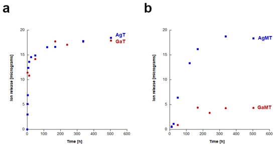 The results of the release study of silver and gallium ions from: AgT and GaT granules (a); AgMT and GaMT granules (b).