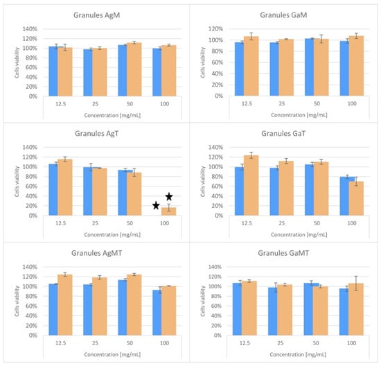 The NRU (blue bars) and MTT (orange bars) tests results obtained for granules in the whole range of tested extracts concentrations. Black stars indicate the decrease in the cells’ viability under 70%, which classifies the sample as cytotoxic.