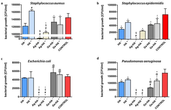 Antibacterial activity of hydroxyapatite powders against 4 bacterial strains: Staphylococcus aureus (a), Staphylococcus epidermidis (b), Escherichia coli (c) and Pseudomonas aeruginosa (d). (ʹ) and (ʺ) symbols accompanying powders designation on X axes indicate their concentration in mixtures (0.1 mg/mL and 1 mg/mL, respectively). (*) symbol indicates statistically significant differences between the samples and control, (#) symbol indicates statistically significant results between HAʹ and the samples, ($) symbol indicates statistically significant results between HAʺ and the samples, (^) symbol indicates statistically significant results between Ag-HAʹ and the samples, (@) symbol indicates statistically significant results between Ag-HAʺ and the samples, (~) symbol indicates statistically significant results between Ga-HAʹ and the samples; according to one-way ANOVA with post-hoc Dunnett’s test or post-hoc Tukey’s test (p < 0.05).