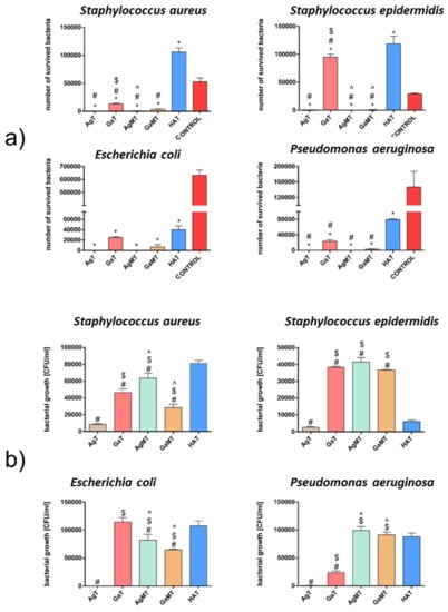 Antibacterial activity according to the AATCC 100-2004 test method (a) and bacterial adhesion (b) of hydroxyapatite-based granules against 4 bacterial strains. (*) symbol indicates statistically significant differences between the samples and control, (#) symbol indicates statistically significant results between the samples and HAT granules, ($) symbol indicates statistically significant results between AgT and all doped samples, (^) symbol indicates statistically significant results between GaT and all doped samples; according to one-way ANOVA with post-hoc Dunnett’s test or post-hoc Tukey’s test (p < 0.05).