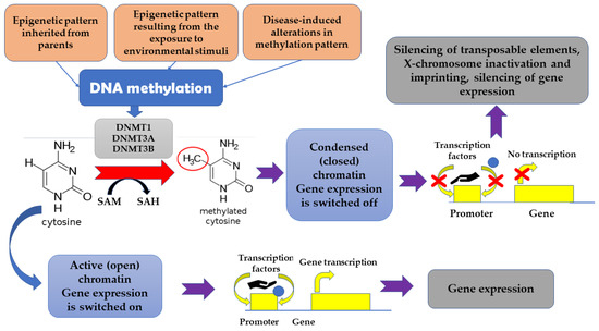 The term “epigenetics” denotes heritable dynamic modifications in the expression of genes which are associated with factors beyond changes in DNA sequence. Such changes can be inherited from parents, but also can be a result of exposure to some environmental stimuli, including drugs, diseases, or diet [15]. It appears that epigenetic changes mirror dynamic associations between an individual’s genetic background and important environmental stimuli [9]. DNA methylation was found to be associated with cell type-specificity [31]. Generally, genome-wide pattern of DNA methylation appears to be conserved across many species. The highest epigenetic conservation is observed in relation to gene regulatory elements and active chromatin modifications. It has been suggested that the epigenetic maintenance and turnover of transcription factor binding sites may serve as a trigger associated with tissue-specific DNA methylation [31]. It is estimated that 60–90% of CpG (cytosine-phosphate-guanine) sites in the mammalian genome are methylated, which results in the presence of 5-methyl-cytosine in these sites [20]. Unmethylated areas are observed primarily in CpG islands which, in turn, are frequently located within the promoters of housekeeping genes and actively transcribed genes [20]. The methylation of DNA reversibly affects gene expression without modifying DNA sequence [32,33]. DNA methylation-related transcriptional downregulation was suggested to be associated with hampering the interaction between transcription factors and their targets as well as with the recruitment of specific transcriptional repressors to the methylated DNA [23]. Apart from being involved in the silencing of transposable elements, X-chromosome inactivation and imprinting, DNA methylation is a powerful tool responsible for transcriptional silencing. DNA methyltransferase 1 (DNMT1), as well as DNMT3A and DNMT3B, are involved in re-establishing of methylation patterns and de novo methylation since they catalyze the addition of a methyl group to the cytosine [34,35]. In turn, the reduction of 5mC to 5-hydroxy-methyl-cytosine (5hmC) is associated with the activity of Ten-Eleven Translocation (TET) proteins [36]. The silencing of genes appears to be associated with the change of chromatin conformation, which make such genes inaccessible for factors required for transcription. Additionally, proteins, such as methyl-CpG binding domain (MBD) proteins, attach to the methylated DNA, thus hampering the transcription. In some cases, DNA methylation can result in the activation of some genes. It happens when the DNA methylation directly hinders those cofactors or miRNA which normally suppresses the transcription [15] (Figure 1).