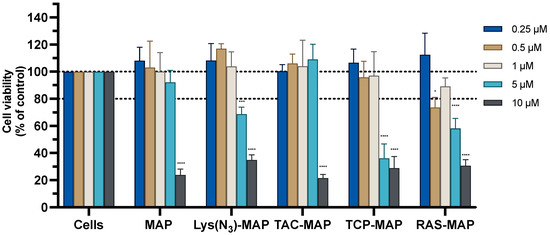 The MTT assay conducted on Caco-2 cells with the treatment of MAP and TAC-MAP demonstrated a significant decrease of cell viability of 20% at 10 µM. On the other hand, Lys(N3)-MAP, TCP-MAP, and RAS-MAP demonstrated more toxicity reflected on the decrease of cell viability of 70%, 40%, and 60% at 5 µM, respectively (Figure 1). The SRB results corroborate with MTT analysis even not reflecting the same values of toxicity (Supplementary Figure S10).