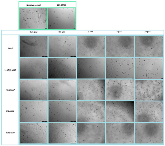Microscope visualization of the treatment with CT25TAC showed no apparent decrease in cell viability and no morphological changes at all concentrations tested when compared to negative control and free TAC (Figure 8). The co-administration test of TAC and TAC-MAP with CT25 blank microscope (CT25 TAC + MAP and CT 25 B + TAC-MAP) images showed corroboration with MTT assay with a decrease in cell viability and severe morphological changes on cell structure (Figure S15). The microscope images obtained after CT2TAC-MAP treatment showed a decrease in cell viability and severe morphological changes, as represented in Figure 8 in the concentration of 0.5 µM. In this case, co-encapsulation of the TAC and Lys(N3)-MAP (CT25 TAC + Lys(N3)-MAP) showed a decrease in cell viability and observed morphological changes at of 1, 5, and 10 µM concentration with complete loss of cell structure and decrease cellular size.
