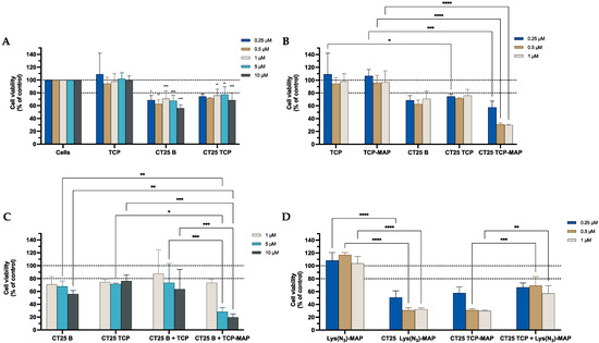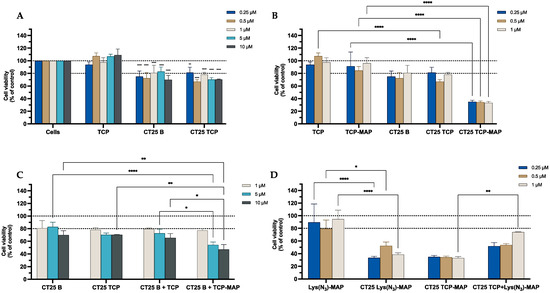 Relative cell viability of Caco-2 cell line measured by the MTT reduction after 24 h incubation. (A) represents NLC safety test with the treatment of free TCP, blank CT25, and TCP-loaded CT25 (0.25–10 µM). (B) Represents differences in the cell viability of treatment with free TCP, TCP-MAP, blank CT25, TCP-loaded CT25, MAP, and TCP-MAP-loaded CT25 (0.25–10 µM). (C) Represents co-administration of TCP and TCP-MAP with blank CT25 (1–10 µM). (D) Represents the data obtained from the encapsulation of Lys(N3)-MAP and co-encapsulation of TCP and Lys(N3)-MAP in the NLC compared with peptide conjugate. Results are expressed as mean ± SD (n = 4). Statistical analysis between the groups was performed using two-way ANOVA with Tukey’s multiple comparisons test (* p < 0.05; ** p < 0.01; *** p < 0.001; **** p < 0.0001).