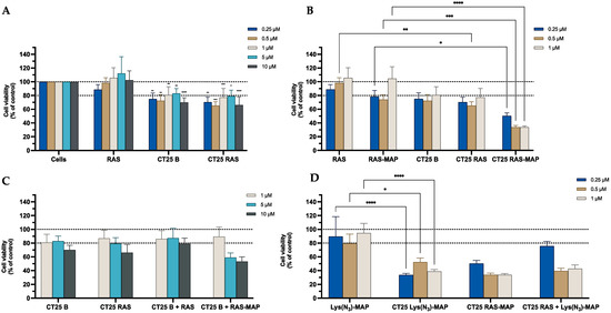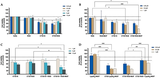 Relative cell viability of Caco-2 cell line measured by the MTT reduction after 24 h incubation. (A) Represents NLC safety test with the treatment of free RAS, blank CT25 and RAS-loaded CT25 (0.25–10 µM). (B) Represents differences in the cell viability of treatment with free RAS, RAS-MAP, blank CT25, RAS-loaded CT25, MAP, RAS-MAP-loaded CT25 (0.25–10 µM). (C) Represents co-administration of RAS and RAS-MAP with blank CT25 (1–10 µM). (D) Represents the data obtained from the encapsulation of Lys(N3)-MAP and co-encapsulation of RAS and Lys(N3)-MAP in the NLC compared with peptide conjugate. Results are expressed as mean ± SD (n = 4 or 6). Statistical analysis between the groups was performed using two-way ANOVA with Tukey’s multiple comparisons test (* p < 0.05; ** p < 0.01; *** p < 0.001; **** p < 0.0001).