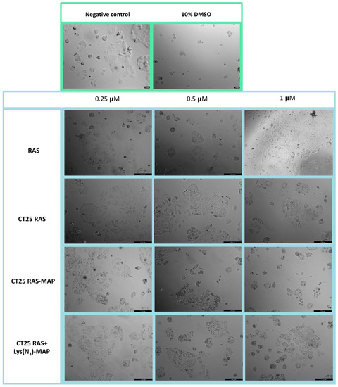 The morphological evaluation of the Caco-2 cell line in Figure 6 showed that treatment with CT25RAS did not result in a decrease in cell viability nor morphological change when compared to the free TCP and negative control (Figure 6). Co-administration of RAS and RAS-MAP with CT25 blank microscope images showed corroboration with MTT assay (Figure S15). With the data obtained from the MTT assay, CT2RAS-MAP treatment showed a decrease of cell viability and severe morphological changes represented in Figure 6 at all concentrations tested. Once again, co-encapsulation of the RAS and Lys(N3)-MAP (CT25 RAS + Lys(N3)-MAP) showed less decrease in cell viability, but we could observe some morphological changes at 0.5 and 1 µM concentrations with cytoplasmatic granulation.