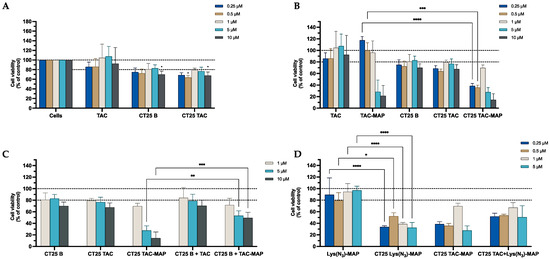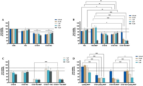 Relative cell viability of SH-SY5Y cell line measured by the MTT reduction after 24 h incubation. (A) represents NLC safety test with the treatment of free TAC, blank CT25, and TAC-loaded CT25 (0.25–10 µM). (B) Represents differences in the cell viability of treatment with free TAC, TAC-MAP, blank CT25, TAC-loaded CT25, MAP, TAC-MAP-loaded CT25 (0.25–10 µM). (C) Represents co-administration of TAC and TAC-MAP with blank CT25 (1–10 µM). (D) Represents the data obtained from the encapsulation of Lys(N3)-MAP and co-encapsulation of TAC and Lys(N3)-MAP in the NLC compared with peptide conjugate. Results are expressed as means ± SD (n = 4). Statistical analysis between the groups was performed using two-way ANOVA with Tukey’s multiple comparisons test (* p < 0.05; ** p < 0.01; *** p < 0.001; **** p < 0.0001).