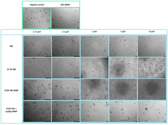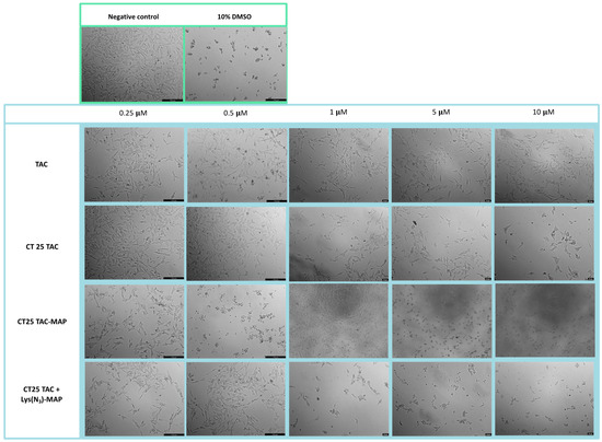 Microscope visualization of the treatment with CT25TAC showed a decrease in cell viability and no morphological changes at 1, 5, and 10 µM when compared to negative control and free TAC (Figure 16). The co-administration assay of TAC and TAC-MAP with CT25 blank (CT25 TAC + MAP and CT 25 B + TAC-MAP) microscope images showed corroboration with MTT assay with a decrease in cell viability at 1 µM and severe morphological changes on cell structure at 5 µM and 10 µM (Figure S21). The microscope images obtained with CT2TAC-MAP treatment showed a decrease of cell viability and severe morphological changes represented in Figure 16 in 0.5, 5, and 10 µM. Moreover, co-encapsulation of the TAC and Lys(N3)-MAP (CT25 TAC + Lys(N3)-MAP) shown in Figure 16 demonstrated a decrease in cell viability and observed morphological changes at of 1, 5, and 10 µM concentrations, with complete loss of cell structure and decrease of cellular size at 5 and 10 µM.