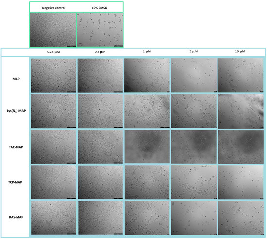 The morphology of SH-SY5Y was evaluated after 24 h incubation with all formulations (Figure 9). The analysis conducted through microscope visualization showed that treatment with MAP at 1 µM and Lys(N3)-MAP at 5 µM decreased substantial cell viability and showed some morphologic change with loss of normal cellular structure and round aspect. Moreover, treatment with free TCP-MAP, RAS-MAP, and TAC-MAP resulted in a decrease of cell density at 1 µM and severe morphological changes with loss of cell structure at 5 µM and 10 µM (Figure 10).