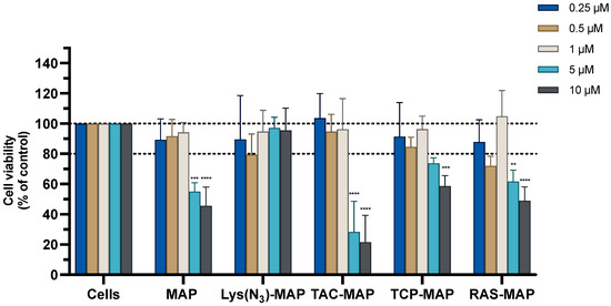 Relative cell viability of SH-SY5Y cell line measured by the MTT reduction after 24 h incubation. Treatment with free MAP, Lys(N3)-MAP, TAC-MAP, TCP-MAPm and RAS-MAP (0.25–10 µM). Results are expressed as means ± SD (n = 3 or 6). Statistical analysis between the control groups was performed using two-way ANOVA with Tukey’s multiple comparisons test (** p < 0.01; *** p < 0.001; **** p < 0.0001).