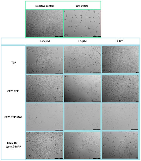 Microscope visualization showed that treatment with CT25TCP showed no alteration on cell viability and no morphological changes on SH-SY5Y when compared to negative control and free TCP (Figure 12). MTT assay showed no differences on co-administration of TCP and TCP-MAP with CT25 blank (CT25 TCP + MAP and CT 25 B + TCP-MAP) and the microscope images showed similar results with decreased cell viability at all concentrations tested (Figure S21). Furthermore, CT25TCP-MAP treatment showed a high decrease in cell viability and severe morphological changes with loss of cell structure at all concentrations represented in Figure 12. The co-encapsulation treatment of the TCP and Lys(N3)-MAP (CT25 TCP + Lys(N3)-MAP) showed a decrease in cell viability at 0.5 µM but no morphological changes at all concentrations (Figure 12).