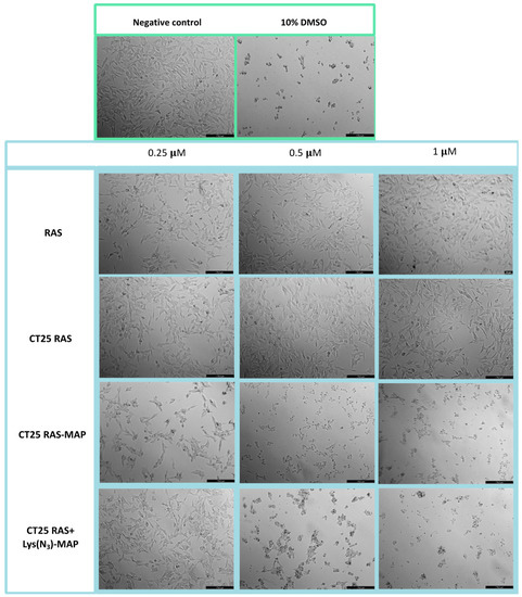 The morphological evaluation of the neuroblastoma SH-SY5Y cell line showed that treatment with CT25RAS resulted in similar cell viability and no morphologic changes compared to the negative control and free RAS (Figure 14). Co-administration of RAS and RAS-MAP with CT25 blank (CT25 RAS + MAP and CT 25 B + RAS-MAP) microscope images showed corroboration with MTT assay with decreased cellular viability at 5 µM (Figure S21). As shown in Figure 14, the treatment of CT25RAS-MAP showed a severe decrease in cell viability and loss of normal cellular structure at 0.5 µM. The co-encapsulation of the RAS and Lys(N3)-MAP (CT25 RAS + Lys(N3)-MAP) treatment showed a decrease in cell viability, but we only observed some morphological changes at the concentration of 1 µM (Figure 14).