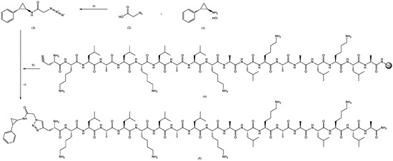 MAP (KLALKLALKALKAALKLA-NH2), TAC-MAP, and RAS-MAP were previously synthetized by our research group as described in refs. [17,28]. Briefly, MAP was synthetized through Fmoc/tBu solid-phase peptide synthesis (SPPS) methodologies assisted with microwave (MW) energy, using a Liberty Microwave Peptide Synthesizer. Conjugation with TAC or RAS was achieved through “click chemistry”—a classical copper-catalyzed azide–alkyne cycloaddition (CuAAC) reaction. In this article, we proceed to the new conjugation of TCP into MAP peptide sequence using the same chemical reaction abovementioned, CuAAC (Figure 17). Details for preparation of TCP-MAP are in the Supporting Materials (Synthesis of TCP-linker-N3, Synthesis of MAP and Synthesis of TCP-MAP, Figures S1–S9).