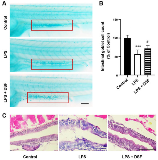 DSF ameliorated intestinal damage of zebrafish embryos after LPS-induced inflammation. (A) The goblet cells in zebrafish intestinal mucosa were stained with alcian blue (red boxes). (B) The intestinal goblet cells (red boxes) in A were enumerated. (C) The histopathological changes in the zebrafish intestine were detected with H&E staining. Data are represented as mean ± S.D. *** p < 0.001 vs. control group; # p < 0.05 vs. LPS group. Scale bar, 100 μm.