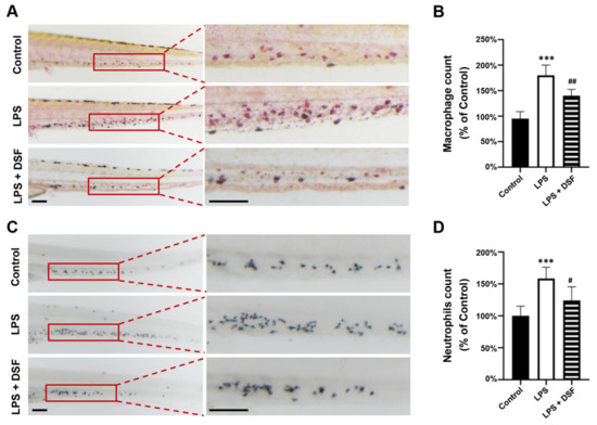 DSF prevented LPS-induced accumulation of macrophages and neutrophils in zebrafish embryos. (A) The macrophages were labeled with Neutral red staining. (B) Quantitative analysis of macrophages in the same area (red boxes) in A. (C) The neutrophils were labeled with Sudan Black B staining. (D) Quantitative analysis of neutrophils in the same area (red boxes) in C. Data are represented as mean ± S.D. *** p < 0.001 vs. control group; # p < 0.05, ## p < 0.01 vs. LPS group. Scale bar, 100 μm.