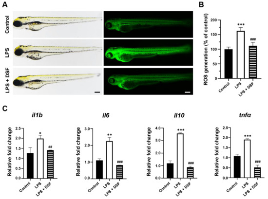 DSF inhibited LPS-induced ROS production and inflammation in zebrafish embryos. (A) ROS generation in zebrafish embryos was detected with fluorescent probe DCFH-DA staining. (B) ROS levels were measured by quantification of fluorescence intensity for individual embryos using fluorescence microscopy and ImageJ analysis. (C) The relative mRNA expression levels of inflammatory markers (il1b, il6, il10, and tnfα) were measured with qRT-PCR. Data are represented as mean ± S.D. * p < 0.05, ** p < 0.01, *** p < 0.001 vs. control group; ## p < 0.01, and ### p < 0.001 vs. LPS group. Scale bar, 200 μm.