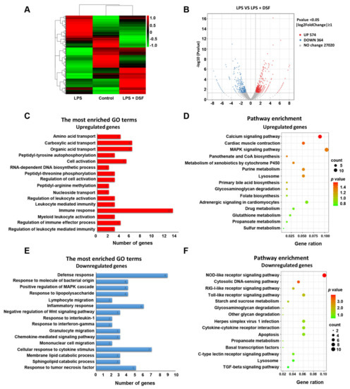 Transcriptome analysis of differentially expressed genes between LPS and LPS + DSF groups. (A) Heat map representation showing a total of 2029 DGEs in control, LPS- and LPS + DSF-treated zebrafish embryos. (B) Volcano plots show a total of 938 DGEs in LPS and LPS + DSF groups. (C) GO term analysis and (D) KEGG pathway analysis for up-regulating DEGs in LPS + DSF zebrafish embryos compared to the LPS group. (E) GO term analysis and (F) KEGG pathway analysis of down-regulated DEGs in LPS + DSF zebrafish embryos compared to the LPS group. The size of the dot indicates the number of genes enriched in an individual item. The color of the dot represents the p value.