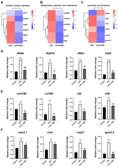 DSF targeting downstream signaling screening and verification. (A) Toll-like receptor signaling, (B) inflammation cytokines and chemokines, and (C) lysosome-apoptosis-related genes explored with heat map analysis and verified with qRT-PCR (D–F). Data are represented as mean ± S.D. ** p < 0.01, *** p < 0.001 vs. control group; # p < 0.05, ## p < 0.01, and ### p < 0.001 vs. LPS group.