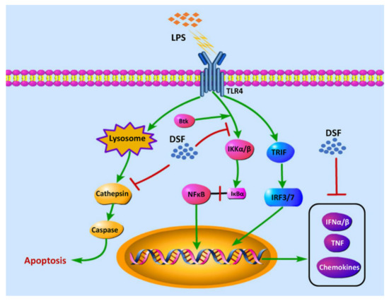 Our previous studies showed that the treatment of the DSF could prevent the inflammatory response and reduce cell death in zebrafish in vivo (Figure 4 and Figure 5). According to the RNA-Seq data obtained here from zebrafish, it was found that the expression of genes involved in Toll-like receptor signaling, inflammation chemokines, and lysosome-apoptosis-related genes was changed in the DSF + LPS group compared with the LPS group (Figure 7A–C). The subsequent qRT-PCR validation in zebrafish whole embryos further revealed that the abnormal expression of Toll-like receptor signaling (ikbkb, ifnphi3, nfkb1, and stat2) and related inflammation cytokines and chemokines (cxcl18b, ccl19b, btk, and tnfb) in the LPS group was significantly restored to normal expression levels in varying degrees after the DSF treatment when compared with the expressions of these genes in control embryos (Figure 7D–E). Meanwhile, when detecting the expression of lysosome-apoptosis-related genes, such as the lysosomal acid hydrolases ctss 2.1 and ctsd, which are related to the synthesis of cathepsin and participate in the apoptotic process [32,33], gzm3.4, which encodes a protein that can activate the caspase chain reaction and lead to apoptosis [34,35], and casp7, from a family of protease enzymes playing important roles in programmed cell death [36], the abnormal expression of these genes was restored in the DSF + LPS group compared with the LPS group (Figure 7F). These findings elucidated the potential mechanism of DSF in the treatment of LPS-induced inflammation and apoptosis by inhibiting the activation of signaling in the Toll-like receptor pathway, attenuating the expression of pro-inflammatory cytokines and chemokines, and regulating the activation of the caspase cascade by restoring the expression of lysosomal cathepsins and apoptosis signaling (Figure 8).