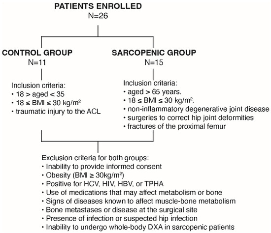A total of 26 patients (15 males, 57%) were enrolled in this study. The sarcopenic group included 15 patients (mean age 82.9 ± 5.1 years), whereas 11 non-sarcopenic patients (mean age 30.8 ± 4.2 years) served as the control group (CTRL). Among the enrolled patients, the CTRL group was programmed for anterior cruciate ligament reconstruction, whereas the sarcopenic group was scheduled for hip replacement, due to primary or secondary osteoarthritis (Figure 1).