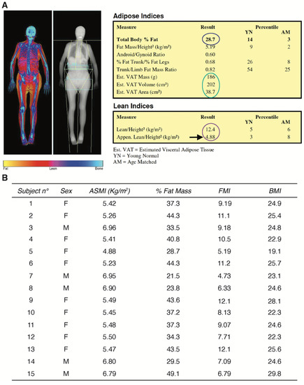 Dual-energy X-ray absorptiometry (DXA) imaging. (A) Representative whole-body image of sarcopenic female patients. The table on the right shows the percentage of total body fat (blue circle), visceral adipose tissue parameters (green circle), and parameters useful for assessing loss of muscle mass (purple circle); (B) results of body composition assessment of all sarcopenic patients who participated in the study: ASMI (appendicular skeletal muscle index for body size), FMI (fat mass index), BMI (body mass index).