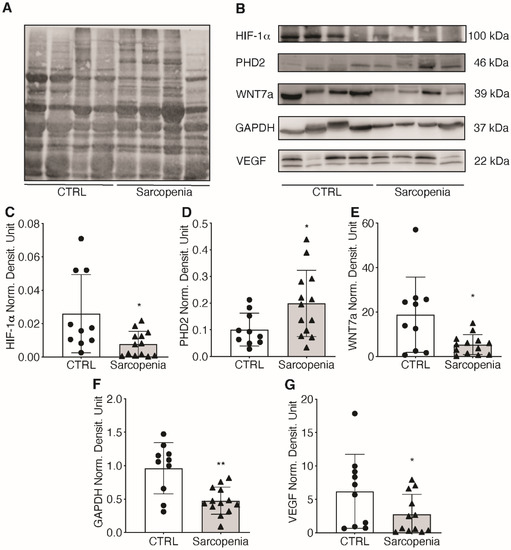 Impairment of HIF-1α in sarcopenic patients. (A) Total proteins of CTRL and sarcopenic patients were stained with Total Revert Protein Solution; (B) Western Blot of HIF-1α and its target genes: PHD2, WNT7a, GAPDH, and VEGF; (C–G) Relative quantification of HIF-1α activation pathway. Statistical significance was determined by the nonparametric Mann-Whitney test. * p < 0.05, ** p < 0.01.
