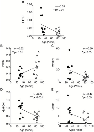 Correlation of HIF-1α signaling pathway and patients’ age. Correlation of (A) HIF-1α, (B) PHD2, (C) WNT7a, (D) GAPDH, (E) VEGF during aging. Statistical significance was determined by Pearson correlation coefficients. * p < 0.05, ** p < 0.01, *** p < 0.001.