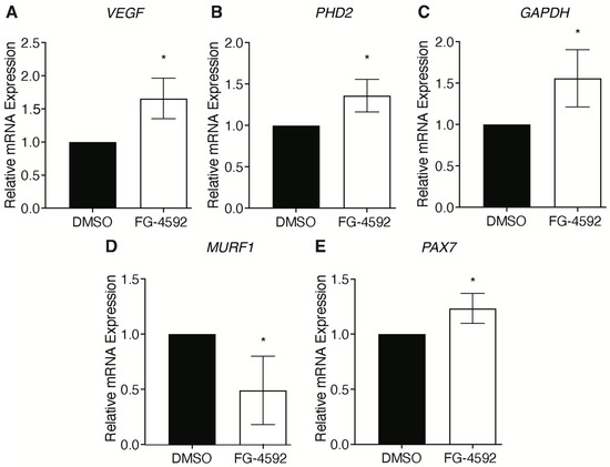 Effects of a pharmacological activation of HIF-1α on skeletal muscle atrophy. Gene expression of HIF-1α target genes in skeletal muscle cells treated with 50 μM FG-4592 for 24 h: (A) VEFG, (B) PHD2, (C) GAPDH. Modulation of (D) MURF1, and (E) PAX7 upon FG-4592 treatment. Statistical significance was determined by t-test. * p < 0.05.