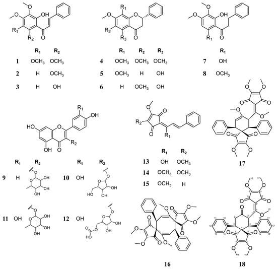 In this study, 18 compounds (Figure 1) were isolated from the leaves of L. erythrocarpa using several chromatographic methods. The chemical structures of the isolated compounds were determined from nuclear magnetic resonance (NMR) and mass spectrometry (MS) data. A novel bi-linderone derivative (18) and 17 known metabolites classified as chalcone, flavonoid, cyclopentenedione, and dimer of linderone were identified.