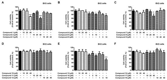 Cytotoxicity of the 18 natural compounds isolated from L. erythrocarpa leaves assayed in BV2 microglia cells (A–F). Cytotoxicity was assessed after treatment with the compounds at concentrations of 1–40 μM for 48 h. Data are presented as the mean ± standard deviation values of three independent experiments. * p < 0.05, ** p < 0.01, *** p < 0.001 vs. control.