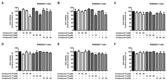 Cytotoxicity of the 18 natural compounds isolated from L. erythrocarpa leaves assayed in RAWA264.7 macrophage cells (A–F). Cytotoxicity was assessed after treatment with the compounds at concentrations of 1–40 μM for 48 h. Data are presented as the mean ± standard deviation values of three independent experiments. ** p < 0.01 vs. control.