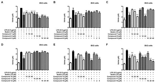 Inhibitory effect of the 18 natural compounds on nitrite production in BV2 microglia cells (A–F). The inhibitory effect on nitrite production in BV2 cells was induced for 18 h by pretreatment with the compound at a concentration of 1–40 μM followed by treatment with lipopolysaccharide (LPS). Data are expressed as the mean ± standard deviation value of three independent experiments. * p < 0.05, *** p < 0.001 vs. LPS.