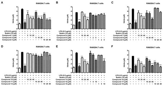 Inhibitory effect of the 18 natural compounds on nitrite production in RAW264.7 macrophage cells (A–F). The inhibitory effect on nitrite production in RAW264.7 cells was induced for 18 h by pretreatment with the compounds at a concentration of 1–40 μM followed by treatment with LPS. Data are expressed as the mean ± standard deviation value of three independent experiments. * p < 0.05, ** p < 0.01, *** p < 0.001 vs. LPS.