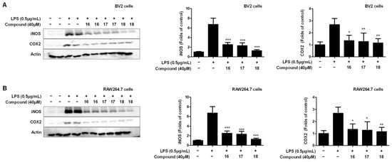 Effect of compounds 16–18 on protein expression levels of nitric oxide synthase (iNOS) and cyclooxygenase-2 (COX-2) in LPS-induced BV2 microglia (A) and RAW264.7 macrophages (B). The inhibitory effect on the expression of the pro-inflammatory proteins iNOS and COX-2 was induced in cells for 18 h by LPS treatment after pretreatment with 40 μM of compounds 16–18. Representative blots of three independent experiments, obtained by Western blotting analysis, are shown. Data are expressed as the mean ± standard deviation value of three independent experiments. * p < 0.05, ** p < 0.01, *** p < 0.001 vs. LPS.