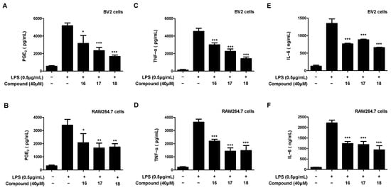 Inhibitory effect of compounds 16–18 on the inflammatory mediators PGE2, TNF-α, and IL-6 in LPS-induced BV2 microglia (A,C,E) and RAW264.7 macrophages (B,D,F). The inhibitory effect on PGE2, TNF-α, and IL-6 production in BV2 and RAW264.7 cells was induced for 18 h by treatment with LPS after pretreatment with 40 μM of the compounds. Data are presented as the mean ± standard deviation values of three independent experiments. * p < 0.05, ** p < 0.01, *** p < 0.001 vs. LPS.