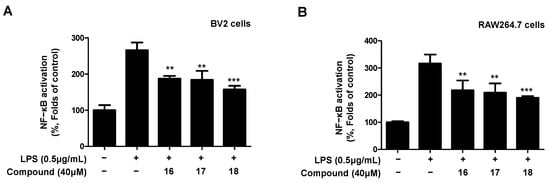 Inhibitory effect of compounds 16–18 on nuclear NF-κB activation in LPS-induced BV2 microglia (A) and RAW264.7 macrophages (B). The inhibitory effect on NF-κB activation in BV2 and RAW264.7 cells was induced for 18 h by treatment with LPS after pretreatment with 40 μM of the compounds. Data are presented as the mean ± standard deviation values of three independent experiments. ** p < 0.01, *** p < 0.001 vs. LPS.